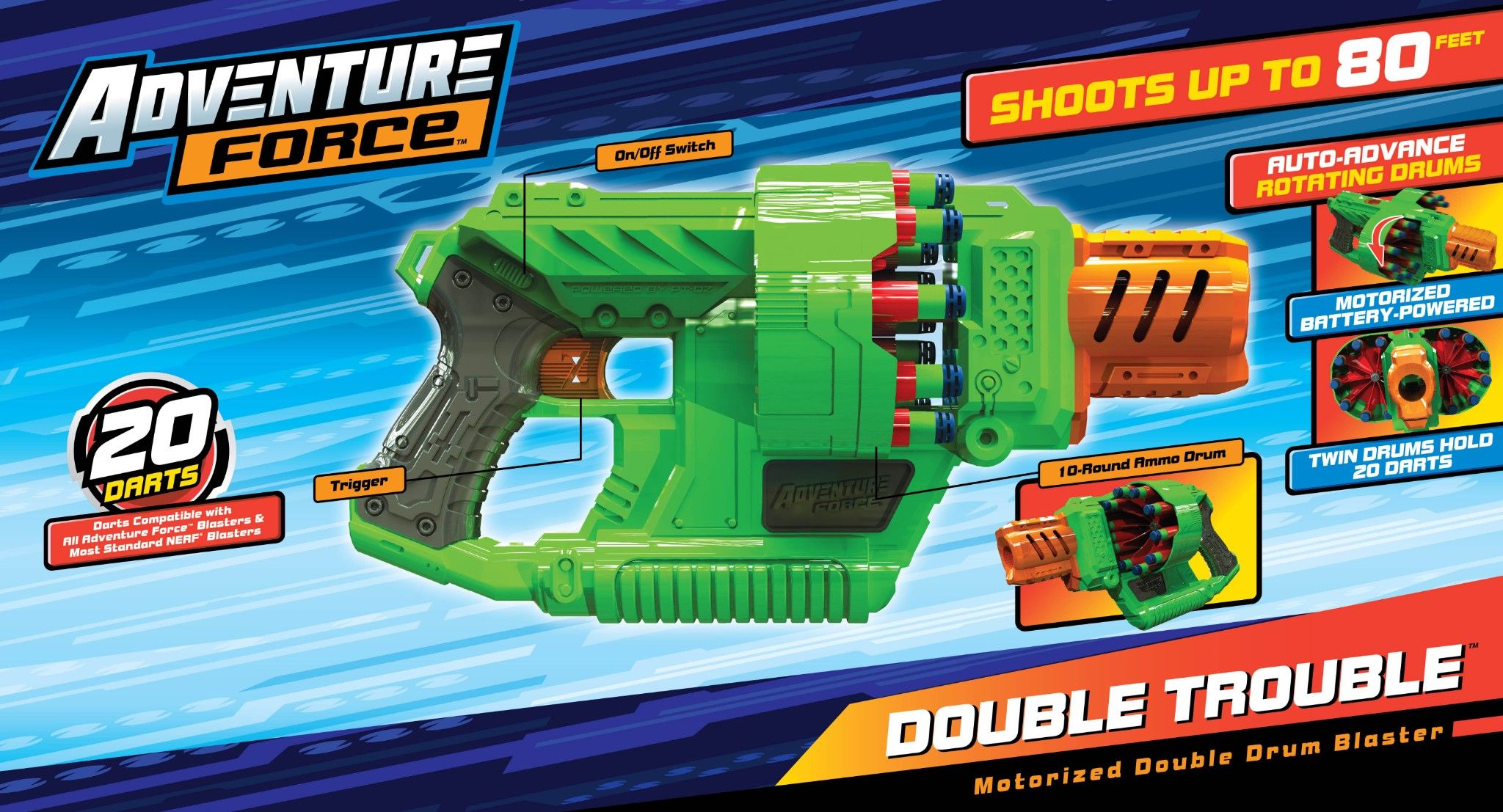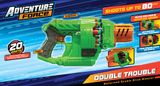 Adventure Force Double Trouble về cơ bản là một khẩu súng đồ chơi ngắn, có thể dễ dàng cầm bằng một tay và mang trên mình một màu xanh lá đặc trưng. Bên cạnh đó, sản phẩm được trang bị mô tơ chạy pin giúp người chơi có thể bắn liên tục mà không cần phải lên đạn thủ công.